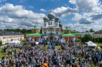 В ходе Первосвятительского визита в Санкт-Петербургскую митрополию утром 9 июля Предстоятель Русской Православной Церкви прибыл в город Тихвин Ленинградской области. В Тихвинском Богородичном Успенском мужском монастыре на площади перед Успенским собором обители Святейший Владыка совершил Божественную литургию. У престола была установлена чудотворная Тихвинская икона Пресвятой Богородицы.