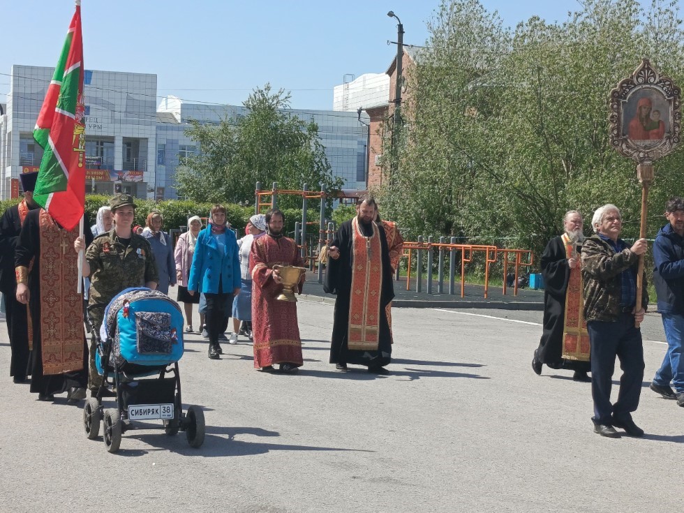Он отметил, что крестный ход проходит с иконой, с одной стороны которой изображен образ Пресвятой Богородицы «Казанская», а с другой — образ пророка Илии, покровителя воинов. Икона взята на крестный крест из часовни во имя праведного Феодора Томского г. Купино.