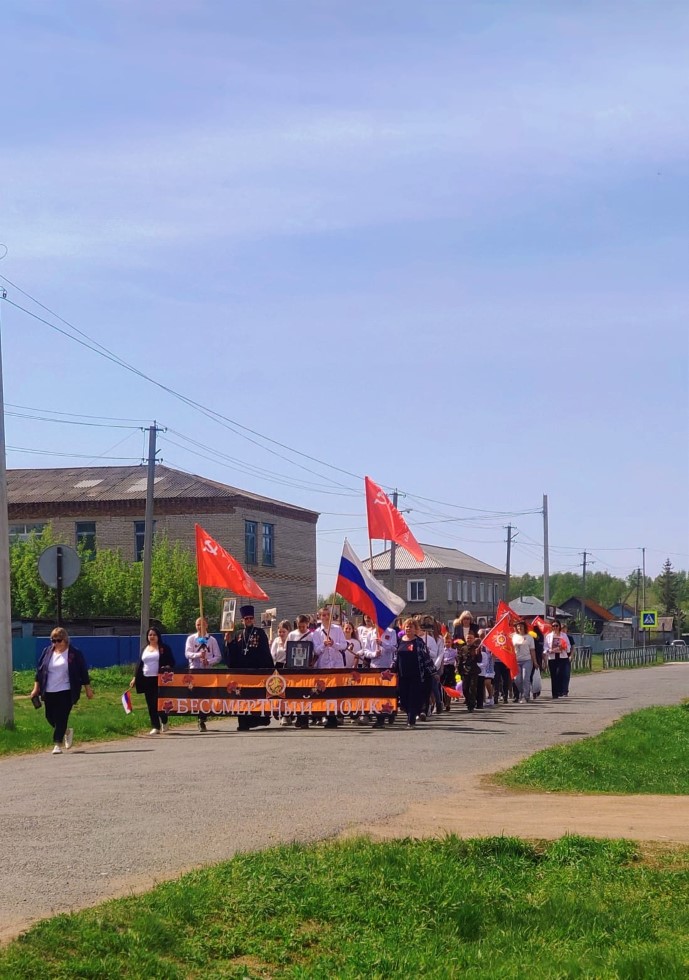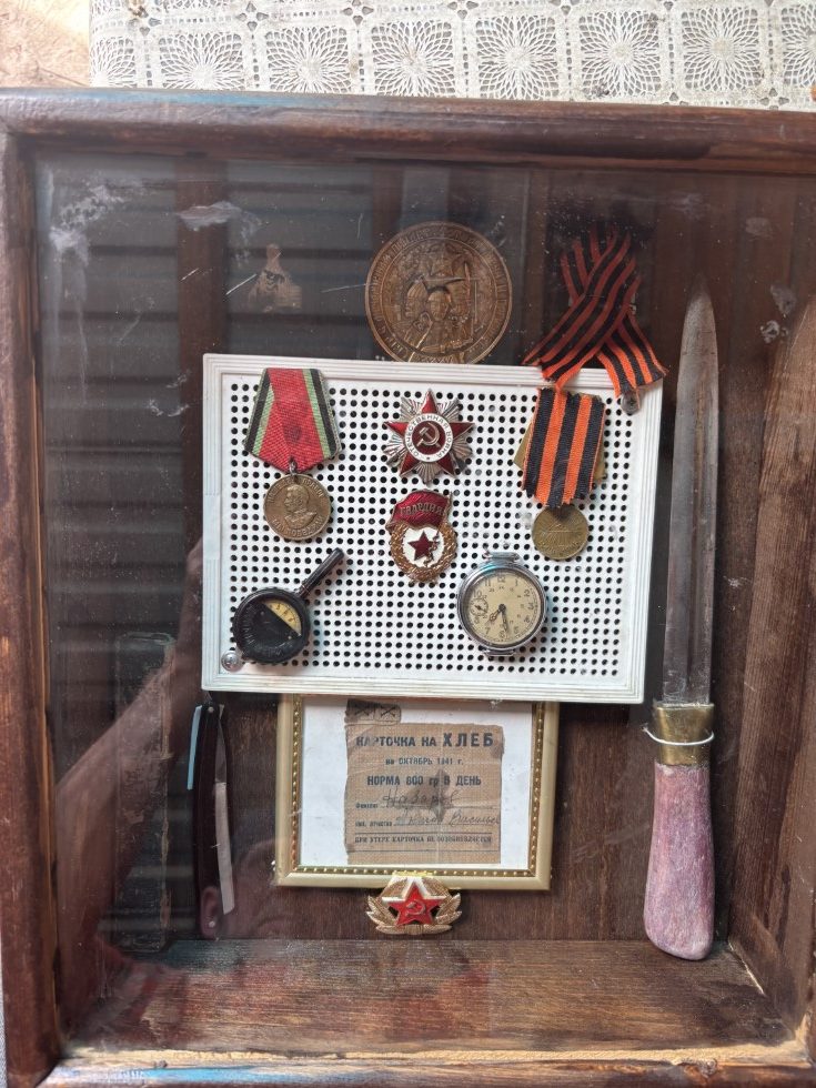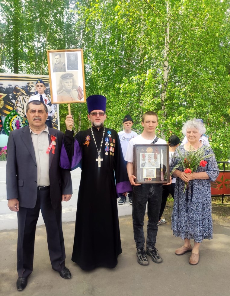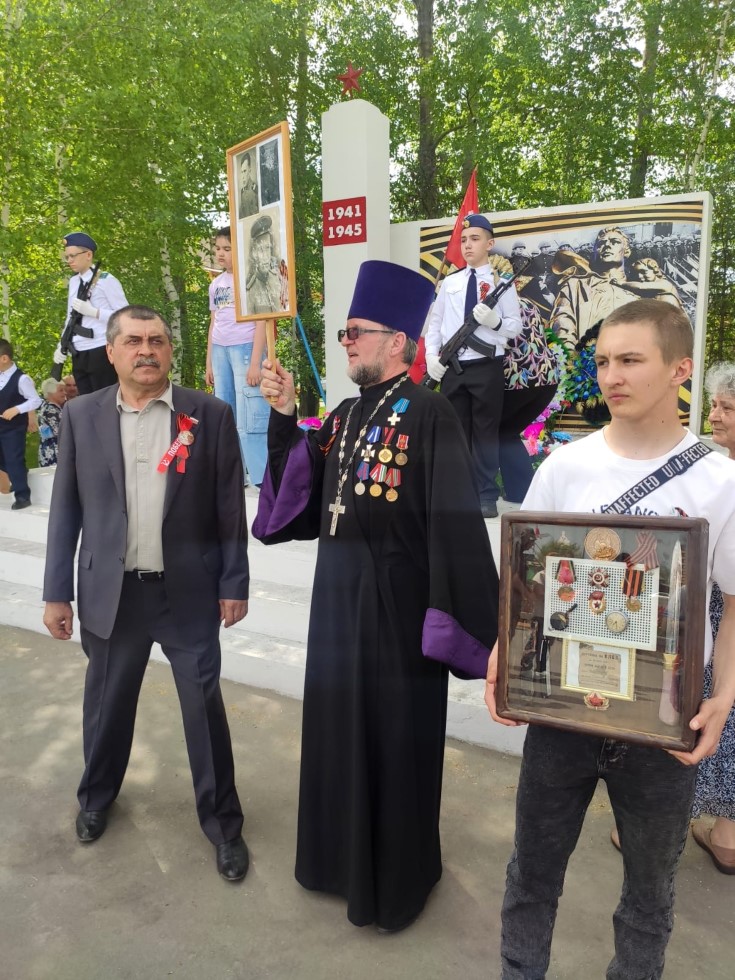 В день праздника Великой Победы настоятель храма во имя прп. Сергия Радонежского р.п. Краснозерское протоиерей Евгений Зверев принял участие в двух митингах и шествиях «Бессмертного полка» в селе Половинном. С собой принес семейные артефакты: орден Отечественной войны деда Михаила, медаль русско- японской войны, немецкий штык, нож, трофейную бритву, икону, прошедшую всю войну — эти свидетели того славного времени — героической победы над сатанизмом.