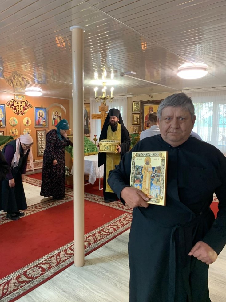 По завершении молебна святыня была доставлена крестным ходом в храм во имя прп. Сергия Радонежского р. п. Краснозерское, где ее тепло и радостно встретил настоятель храма протоиерей Евгений Зверев с прихожанами храма.