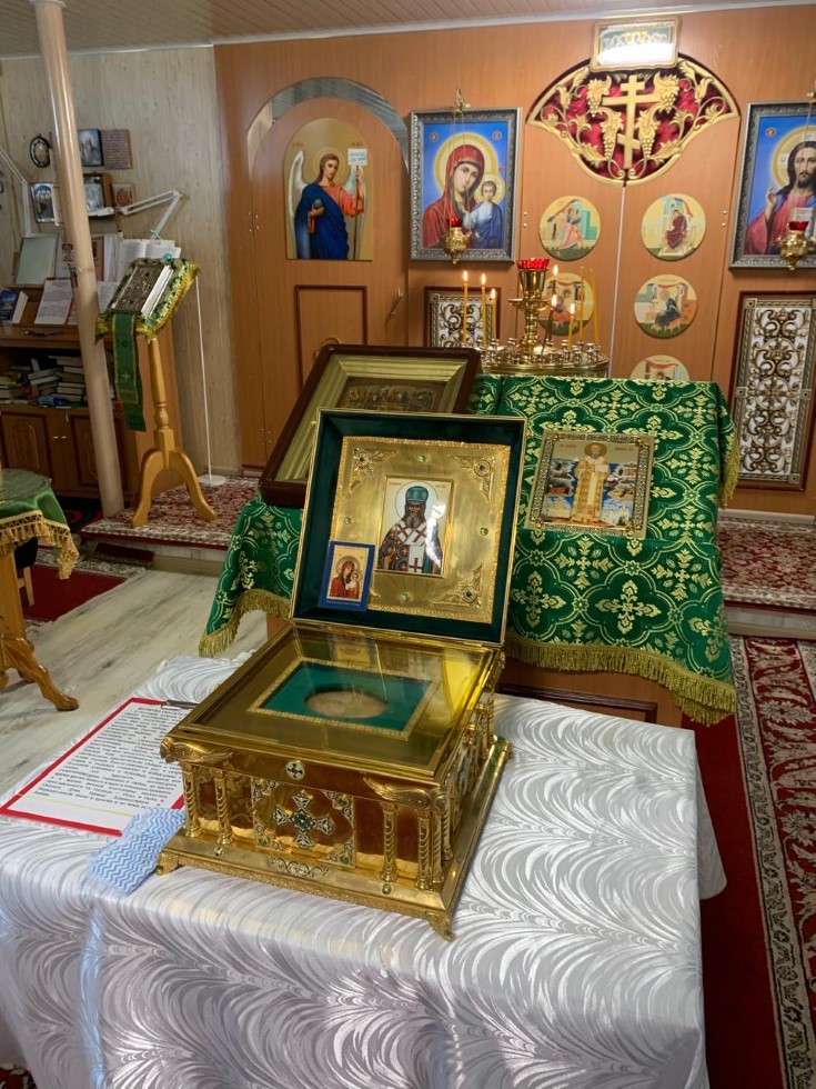 В 18.00 ковчег с честной главой святителя Иннокентия доставил в собор в честь Живоначальной Троицы р. п. Ордынское благочинный Центрального округа Карасукской епархии иеромонах Мелхиседек. Его торжественно встретил настоятель собора иерей Николай Иванов с прихожанами.