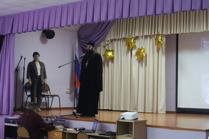 С приветственным словом к обучающимся обратилась директор школы Екимова Тамара Дмитриевна, учитель русского языка и литературы, ее предварила ведущая мероприятия, которая поведала о жизненном подвиге Патриарха Тихона. Далее был показан документальный фильм о жизненном пути и почитании Патриарха Московского Тихона, созданный творческой группой студии «Лики святых» при поддержке Фонда президентских грантов. В фильме впервые показаны уникальные документы из российских архивов и впервые обнародована видеосъемка исторического момента обретения святых мощей Патриарха Тихона 22 февраля 1002 г.