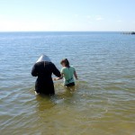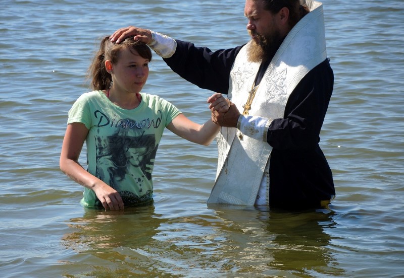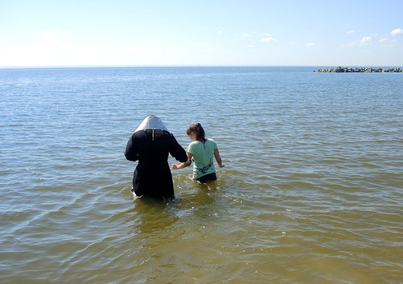 Вначале был совершен чин освящения воды Обского моря, а затем совершено Таинство Крещения детей. После чего все дети радостные и довольные с неописуемым восторгом искупались не просто в Обском море, но в освященной воде Обского водохранилища.