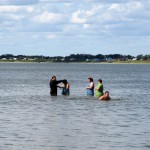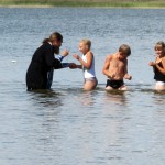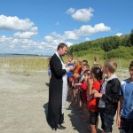 В настоящее время в лагере отдыхают 200 детей из разных районов Новосибирской области. Владыка побеседовал с детьми о православной вере, о таинствах, отвечал на вопросы. У многих появилось желание принять святое Крещение. Летний лагерь расположен на берегу живописного озера, поэтому решили никуда не ехать, а крестить в его водах.