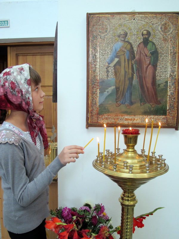 В трапезной были прихожане и из старого храма во имя св. равноапостального князя Владимира, которые посещали его еще при почившем отце Алексее. Они рассказали несколько интересных случаев обновления иконы св. апп. Петра и Павла и о иконе Богородицы, у которой были выколоты глаза.
