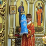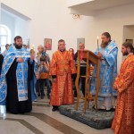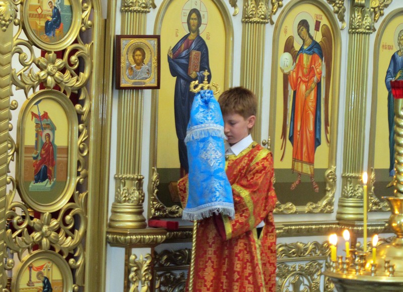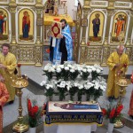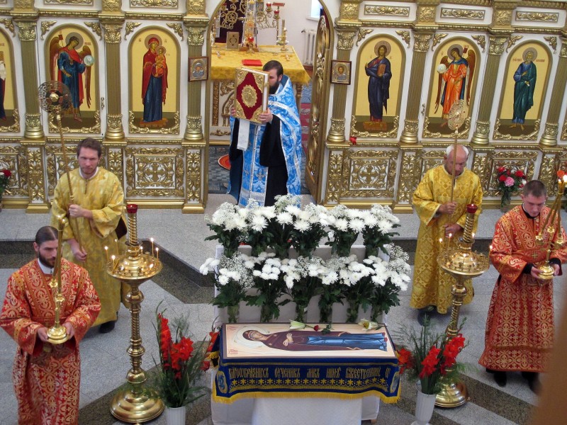 Впервые со времени его освящения была вынесена на середину храма украшенная цветами плащаница Божией Матери, которую специально для праздника Успения Пресвятой Богородицы доставили из Новосибирской митрополии.