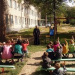Владыка рассказал детям о православной вере. Оказалось, что сейчас здесь много новеньких детей и много из них некрещенных. Поэтому Владыка пообещал приехать сюда через месяц и совершить Таинство Крещения над всеми некрещенными детьми.
