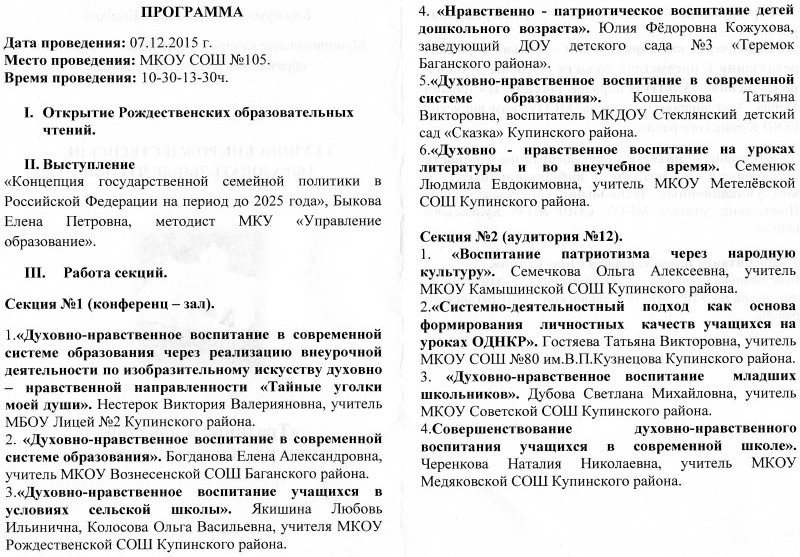 7 декабря 2015 года в МКОУ СОШ № 105 г. Купино проведены I Купинские Рождественские образовательные чтения. Тема Чтений: «Традиции и новации: культура, общество, личность». Чтения были организованны совместными усилиями «Управления образования Купинского района» и Отделом образования Карасукской епархии.