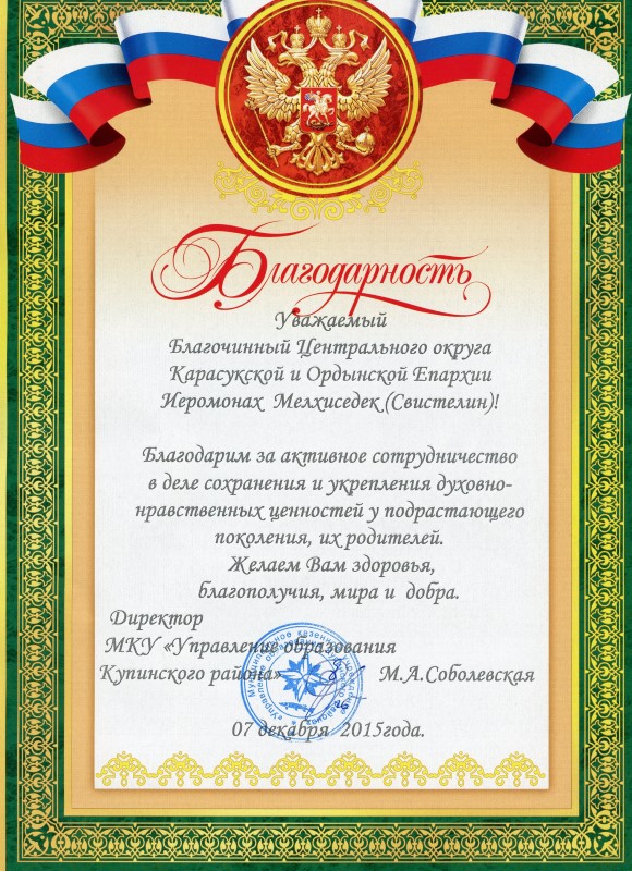 С приветственными словами к гостям обратились Марина Анатольевна Соболевская, директор МКУ «Управление образования Купинского района». Она обратила внимание всех присутствующих на то, что модель Рождественских чтений в виде педагогической конференции позволит выявить, обобщить и распространить лучший педагогический опыт работы по духовно-нравственному просвещению и воспитанию обучающихся в сфере государственного и церковного образования, развить взаимодействие государства, церкви, образования, общества по вопросам воспитания и развития школьников. Она вручила грамоты и Благодарственные письма от Министерства образования Новосибирской области педагогам — участникам конкурса «За нравственный подвиг учителя».