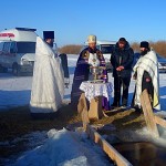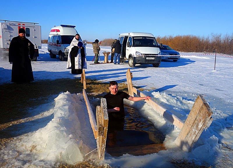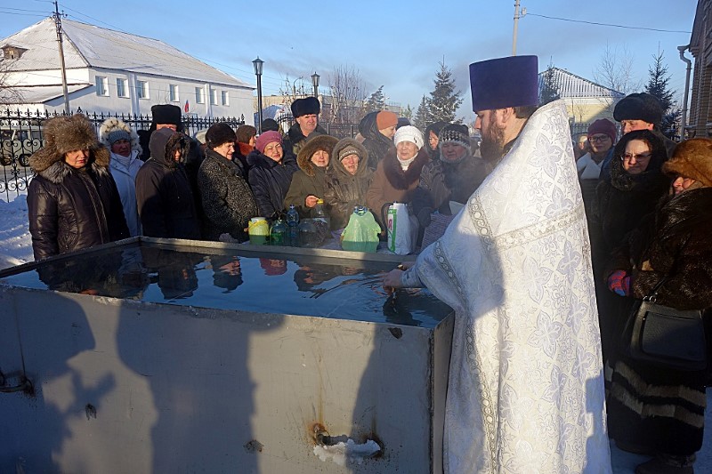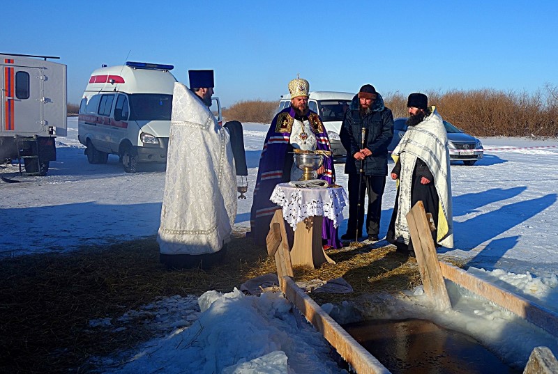 По окончании богослужения епископ Филипп, духовенство и прихожане собора поехали на транспорте в с. Грамотино Карасукского района, где в акватории местной реки, в заранее приготовленной иордани-проруби, было совершено освящение воды.