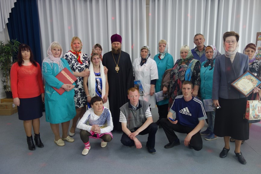 Владыка рассказал присутствующим об истории праздника Пасхи, вручил сладкие подарки, иконки и посетил маломобильных пациентов в жилых комнатах, а так же вручил архиерейскую грамоту секретарю отдела по церковной благотворительности Брынцаловой Лилии Алексеевне за организацию и проведение в интернате активной работы в этой области.