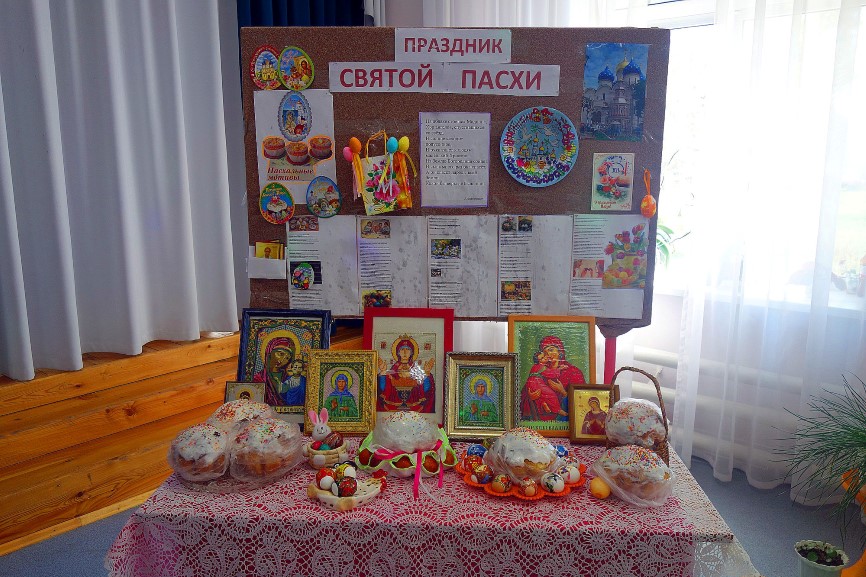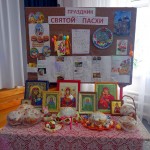 К визиту Владыки проживающие совместно с сотрудниками отделения социальной реабилитации оформили стенд с праздничной пасхальной тематикой, на накрытом столе были выставлены пасхальные куличи и яркие раскрашенные яйца, а так же работы инвалида 1 группы Анисимовой Нины, вышивки икон.