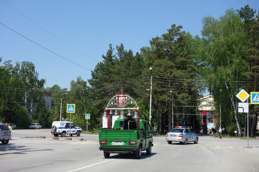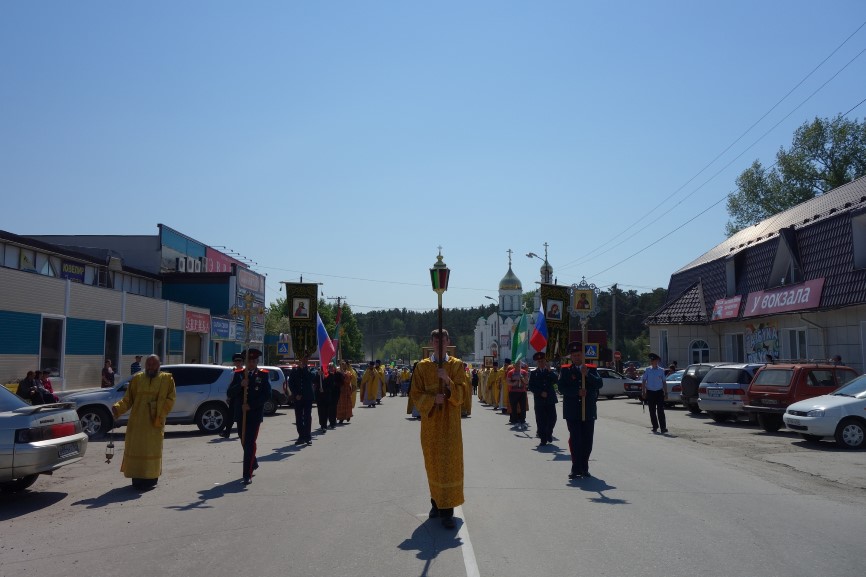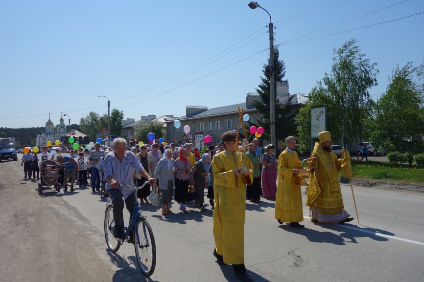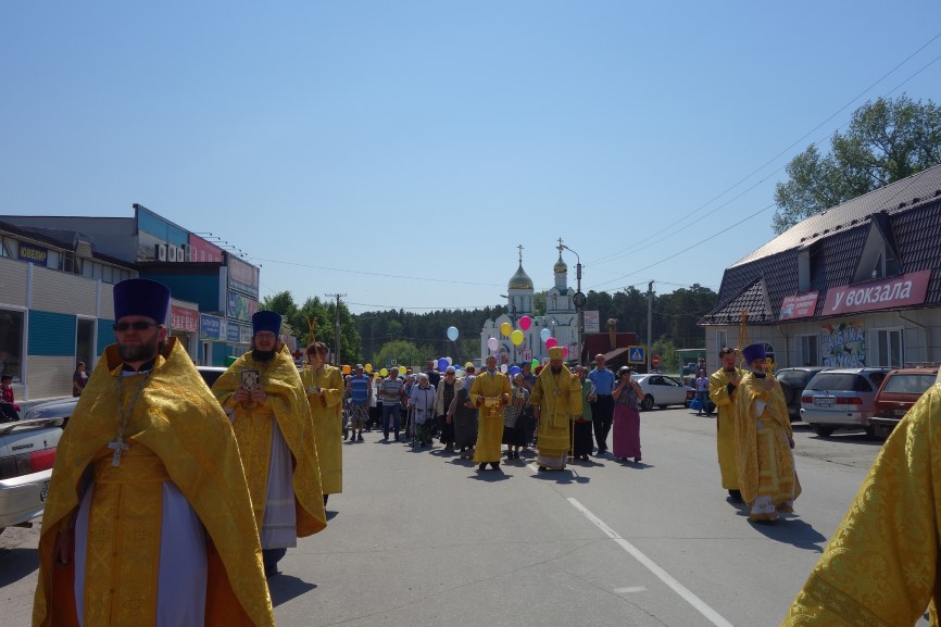 24 мая/вторник. После Божественной литургии Его Преосвященство епископ Филипп, духовенство Карасукской епархии, казаки, ученики местных школ и прихожане Собора совершили крестный ход от собора в честь Живоначальной Троицы р. п. Ордынского по центральной улице рабочего поселка до храма во имя Святителя Николая Чудотворца.