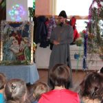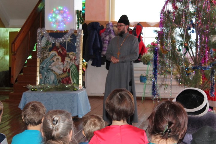 Батюшка поздравил детей со светлым праздником Рождества Христова, рассказал им о событиях той далекой рождественской ночи, окропил всех святой водой, подарил на память иконочки Спасителя и вручил мягкие игрушки и сладкие подарки.