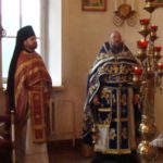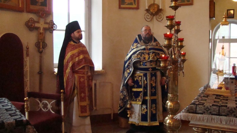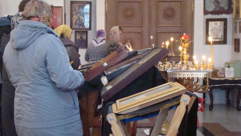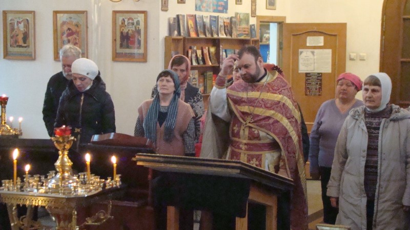 В храме иеромонах Мелхиседек в сослужении иерея Илии Березовского, настоятеля Успенского храма р.п. Чистоозерное, совершил Божественную литургию. На богослужении находились великие святыни: ковчег-мощевик, икона святого священномученика Харалампия с мощами, икона святителя Макария, митрополита Алтайского и Московского, с мощами, икона святой блаженной Матроны Московской с мощами, прибывшие 23-го марта крестным ходом в Успенский храм.