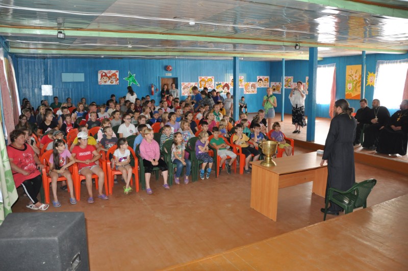 В этот день состоялась встреча епископа Филиппа с сотрудниками и детьми лагеря. Владыка рассказал о православной вере, об истории разрушенного храма и о праздновании Почаевской иконы Божией Матери.