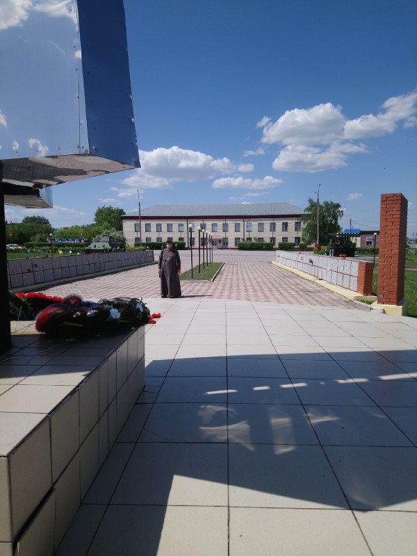 В 12.00 после колокольного звона иерей Димитрий Мжельский, настоятель храма во имя святых страстотерпцев Бориса и Глеба, совершил благодарственный молебен и панихиду по усопшим воинам православным, жизнь свою за веру, Отечество и народ Божий положивших, от ран и голода скончавшихся, в плену убиенных, в тылу для Победы потрудившихся, и литию.
