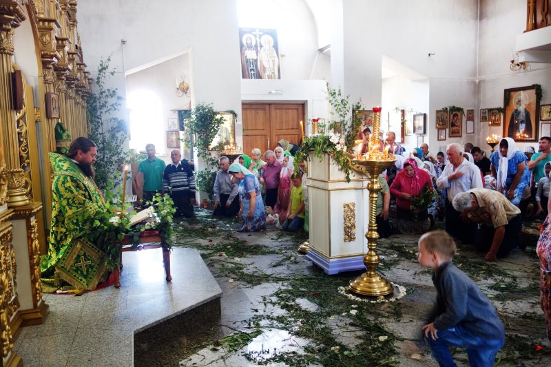 Внутренне убранство собора в этот день удивительно преобразилось: вход в него, его стены и иконы по русской традиции были украшены березовыми ветвями с молоденькими листочками. Священнослужители также были облачены в одежды изумрудного (зеленого) цвета, изображающего животворящую и обновляющую силу Святого Духа.