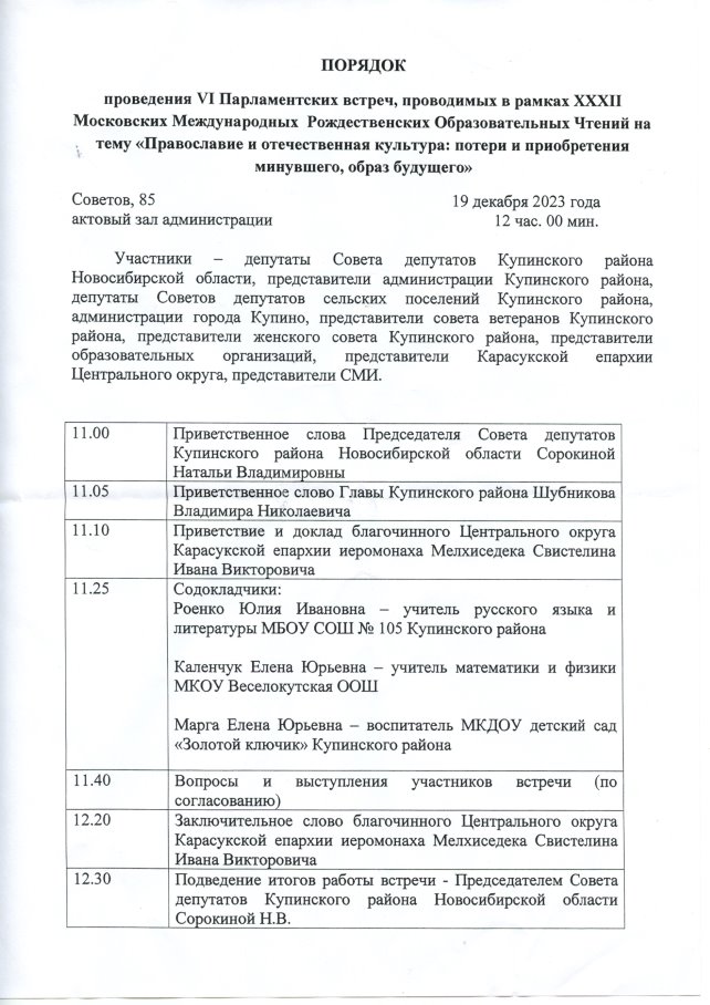 19 декабря в актовом зале администрации Купинского района состоялись VI Рождественские Парламентские встречи, которые прошли в рамках IX Купинских Рождественских образовательных чтений, тема которых «Православие и отечественная культура: потери и приобретения минувшего, образ будущего».