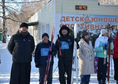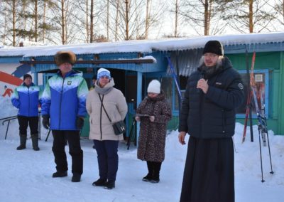 Священник произнес напутственные слова перед собравшимися лыжниками, пожелал им сил, терпения, хорошей лыжни и напомнил, что не только физические успехи важны для человека, но и его духовная жизнь.