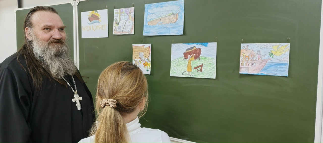 Батюшка начал беседу с краткого исторического экскурса: он рассказал школьникам, что слово «Завет» — это и есть Священное Писание и обозначает особый союз (договор), который Бог заключает с людьми.