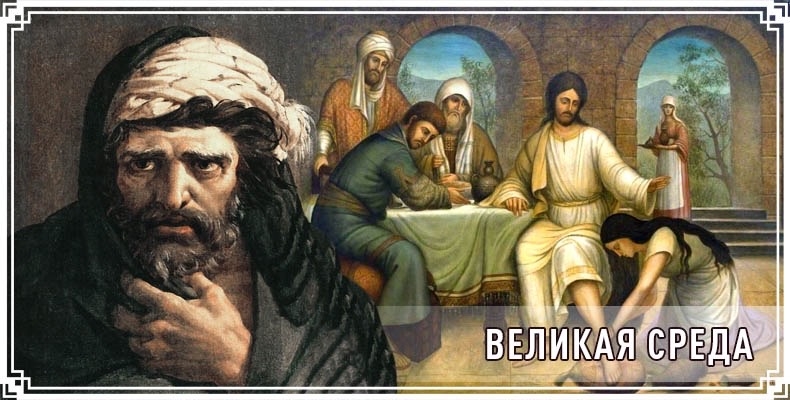 …Ночь со Вторника на Среду Господь провел в Вифании (Мф 26, 6-17). Здесь, в доме Симона прокаженного, в то время, когда в совете первосвященников, книжников и старейшин было уже решено взять Христа хитростью и убить Его, — некая жена — «грешница» возлила драгоценное миро на главу Спасителя и тем уготовала Его на погребение, как Он Сам объяснил ее поступок. Здесь же, в противоположность бескорыстному поступку жены-«грешницы», родилось в неблагодарной душе Иуды, одного из двенадцати учеников Спасителя, преступное намерение предать беззаконному совету своего Учителя и Господа. Поэтому в церковной службе Великой Среды прославляется жена-«грешница» и порицается и проклинается сребролюбие и предательство Иуды.