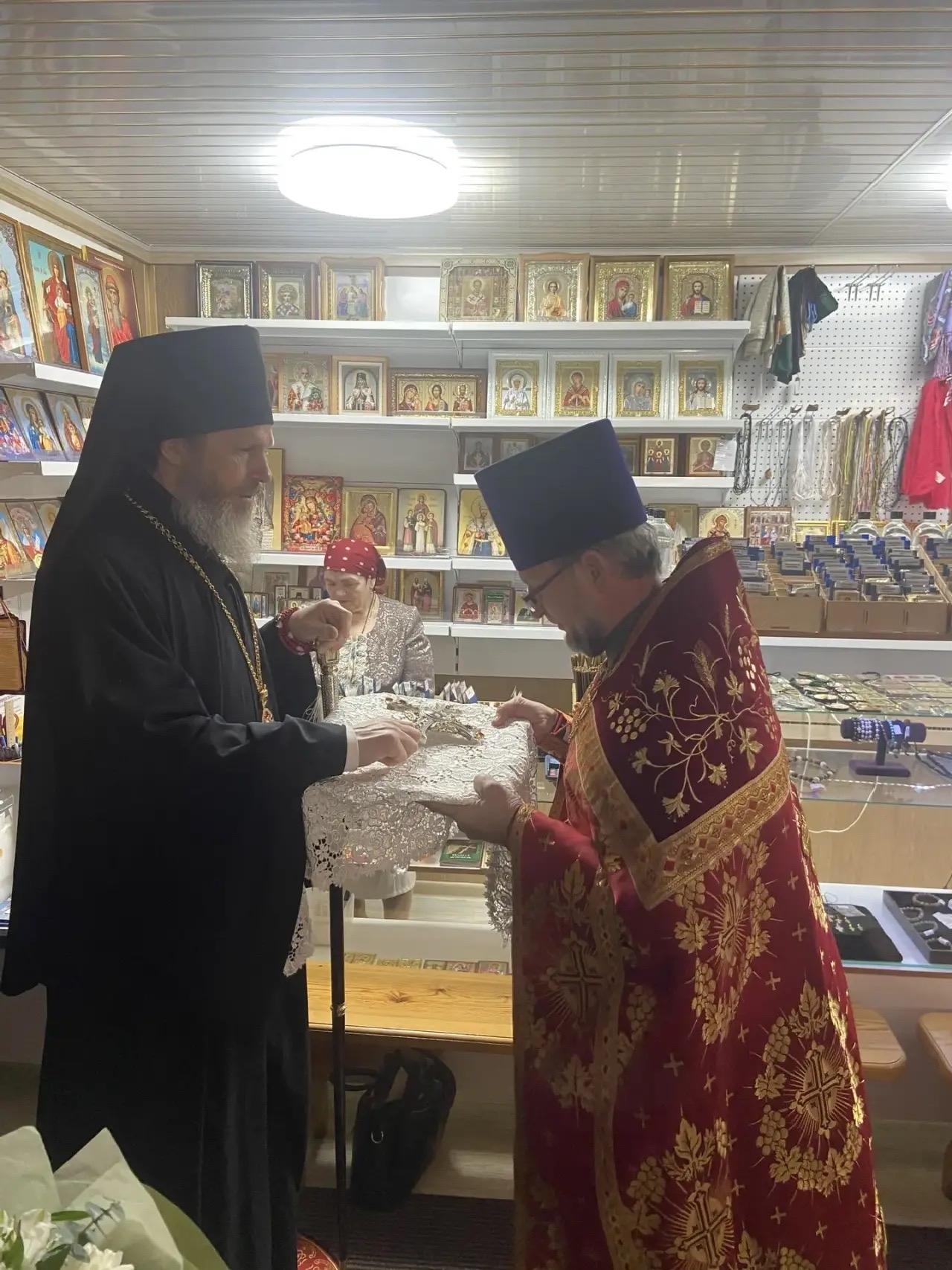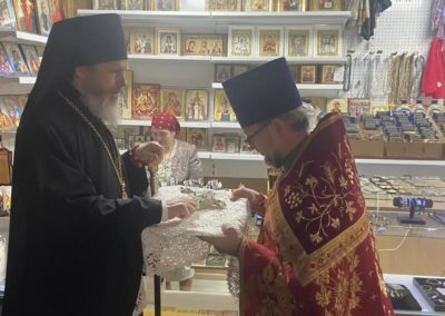 По завершении пасхального крестного хода настоятель храма протоирей Евгений Зверев ознакомил Владыку с интересным музеем, устроенным им в храме в честь Успения Пресвятой Богородицы села Половинного, и рассказал об истории храма.