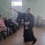 Глаза пожилых людей были наполнены радостью, когда ученики вручали им цветы и пакеты с фруктами. Иерей Мефодий заходили в каждую комнату, благословлял пожилых людей, отвечал на их вопросы.