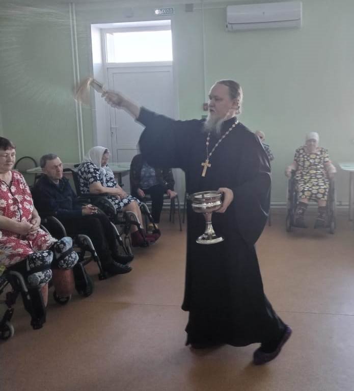 В день Святого Крещения были подготовлены емкости с крещенской святой водой и сладости, которые раздали каждому пожилому человеку. Иеромонах Мефодий (Сиваков) окропил всех насельников Дома милосердия святой водой.