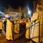 Молитвенное шествие остановилось у закрытых западных ворот собора, как бы у дверей гроба Христова, и здесь Владыка, как когда-то Ангел, возвестивший мироносицам у гроба о воскресении Христовом, первым возвестил радостную весть: “Христос воскресе из мертвых…”. Владыка, держа в руках крест с трехсвечником, сделал перед закрытыми вратами знамение креста и они отворились и все ликующие с радостною песней “Христос воскресе из мертвых” вошли в здание собора, залитое светом зажженных светильников и лампад.