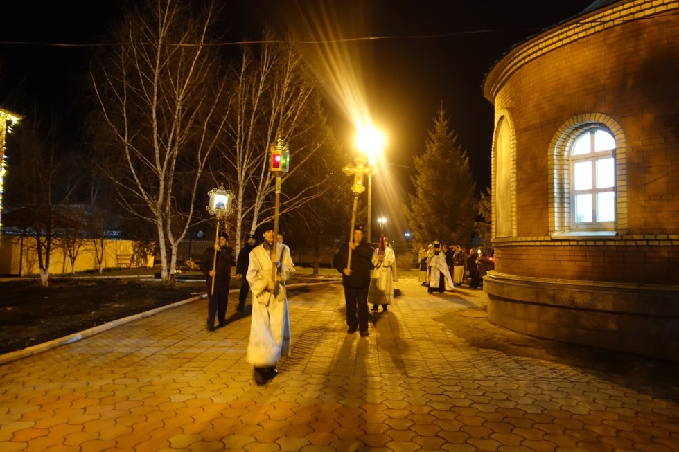 Под пение третьей стихиры открылись Царские врата и Владыка с клириками, Крестом, светильниками и фимиамом вышел из алтаря и вместе с певчими и прихожанами собора, держащими в руках хоругви и иконы. В это время с высоты колокольни, как с небес, разносился ликующий пасхальный звон.