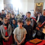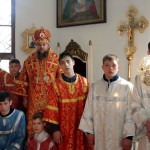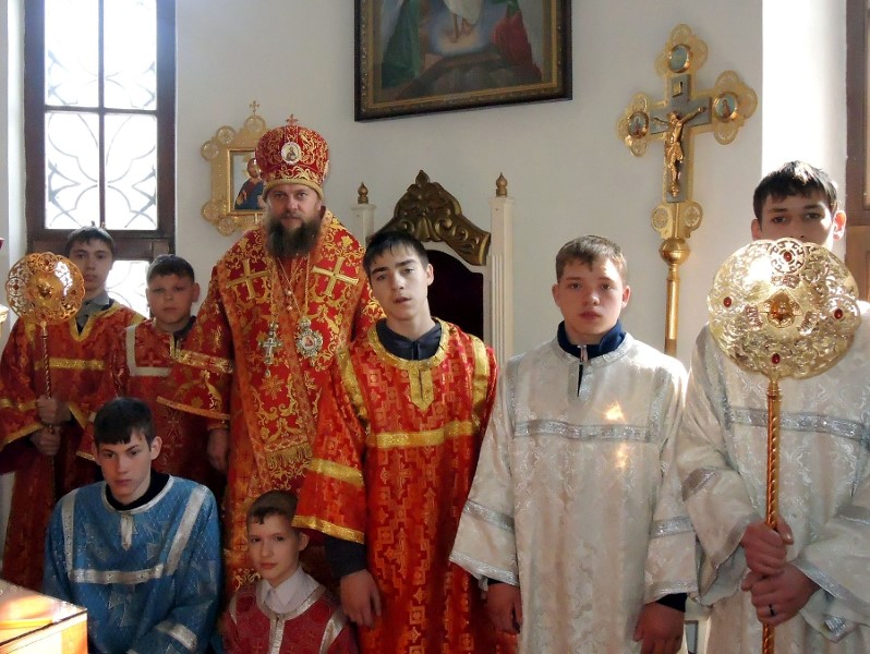 За Божественной литургией часть молодых ребят находилась в алтаре: дети помогали Владыке и исполняли обязанности иподиаконов и пономарей, часть детей пела на клиросе.