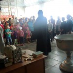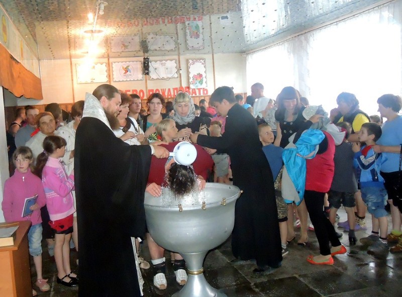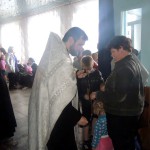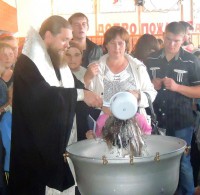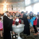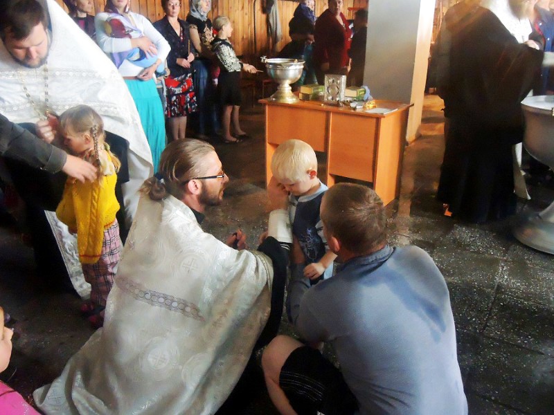 По традиции Владыка обратился к сельчанам с проповедью и огласительной беседой, совершаемой перед Таинством Крещения. Отслужили краткий молебен и Владыка окропил всех присутствующих святой водой. Затем состоялось Таинство Крещения.