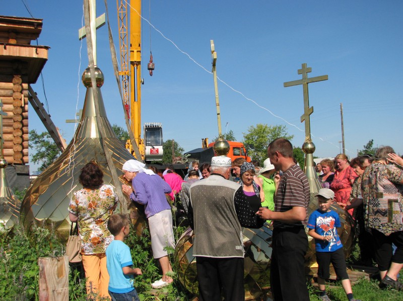 После освящения крестов священник и народ с радостью и благоговением целовали Святой Крест. После чего строители стали производить установку на храм главного купола с крестом.