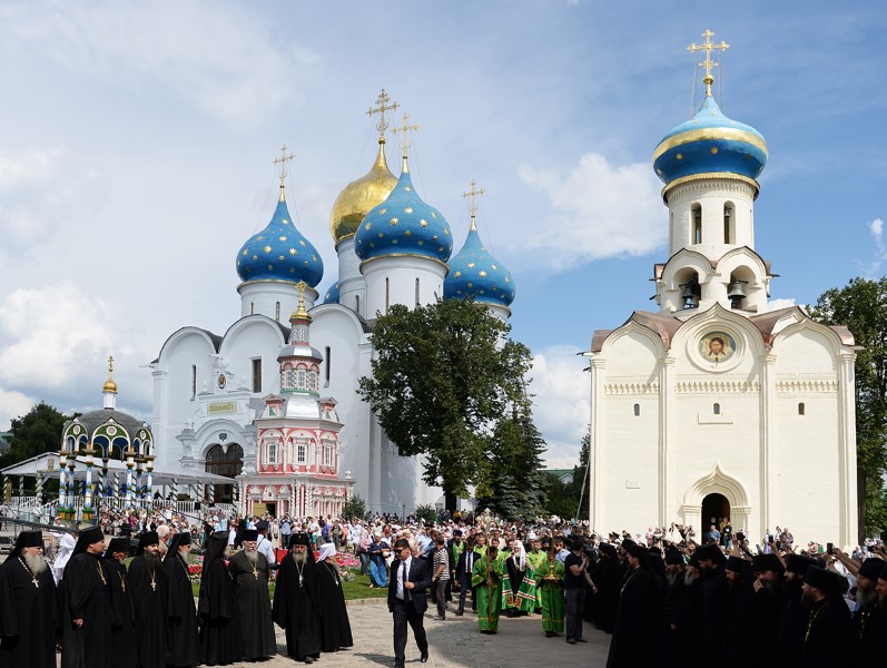 В 9.00 состоялась праздничная Божественная литургия на Соборной площади Троице-Сергиевой Лавры, которую возглавил Патриарх Кирилл в сослужении прибывших на торжества Преосвященных архиереев и духовенства.