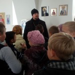 После чего состоялась экскурсия в храм во имя св. мцц Веры, Надежды Любови и матери их Софии. Батюшка рассказал детям о вере, Боге, Богородице и святых, об устройстве храма.