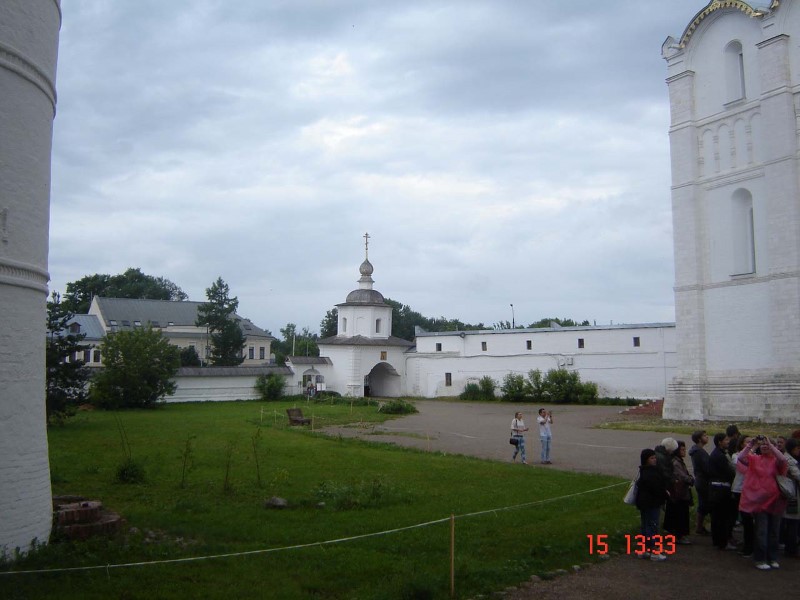 Когда подъезжали к нему, сразу открылся прекрасный вид на древние белокаменные монастыри за рекой. Въехали в центр и пошли пешком по булыжной мостовой к крепостному валу над рекой, с которого открылся удивительный вид сверху на древние монастыри. Прошли по тропинке над обрывом и вышли к кремлю, который существует с 10 века. Обошли водяной ров и вошли в Ризоположенский женский монастырь 1207 г. основания.