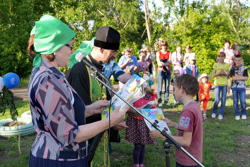 После молебна маленькие, празднично разодетые школьники поздравили стихами и песенками всех присутствующих, а взрослые рассказали о значении Святой Троицы. Потом все вместе водили веселый хоровод. После чего священник торжественно наградил ребятишек и преподавателей местной школы почетными грамотами, молитвословами и сладкими подарками за все добрые христианские дела, в которых они принимали участие: детские выставки и концерты, посвященные Святой Матери Церкви.
