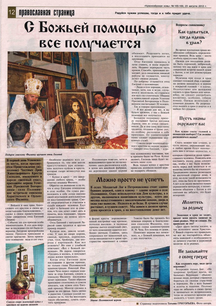 Освящение купола и креста в с. Половинное. Впервые за 100 лет была совершена литургия архиерейским чином в Половинном. А в селе Махнатый Лог разрушают старый храм вытаскивают окна и все молчат.