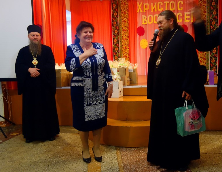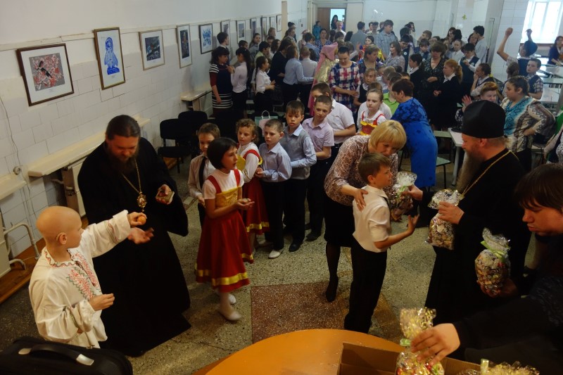 После чего епископ Лука, управляющий Искитимской епархией, тепло поздравил детей с праздником Пасхи, а владыка Филипп задал детям вопросы, связанные с праздником Воскресения Христова. Затем дети вместе с Владыками пропели тропарь праздника Пасхи «Христос Воскресе из мертвых…». Владыки окропили всех святой водой и каждому ребенку и взрослому вручили крашеное яйцо, икону и сладкий подарок.