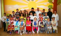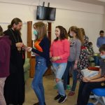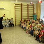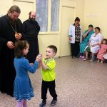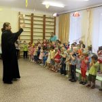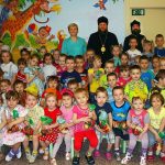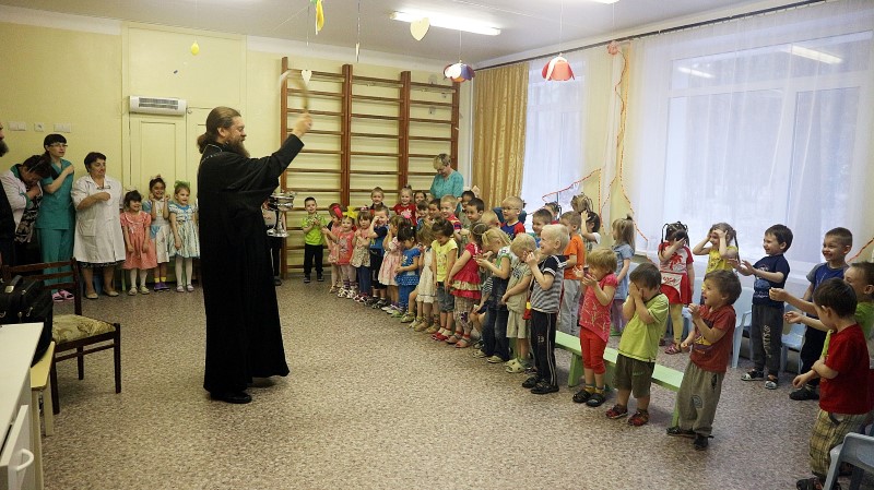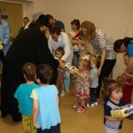 После такого небольшого экзамена Владыка напомимнает детям как правильно наносить крестное знамение, читает вместе с ними молитву и окропляет всех святой водой. Сколько в эти минуты слышно вокруг радостных возгласов, детского смеха! А уже после этого Владыка раздает им сладкие подарки и иконочки.