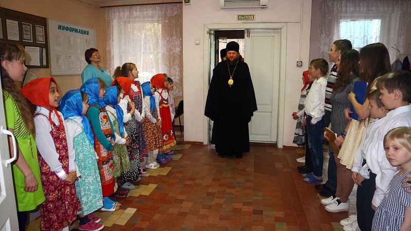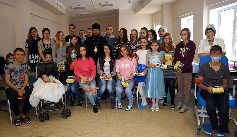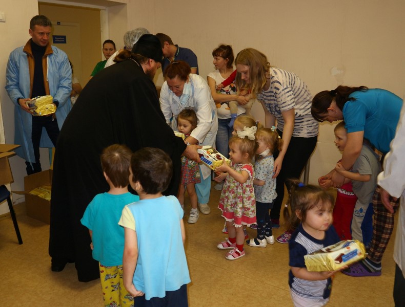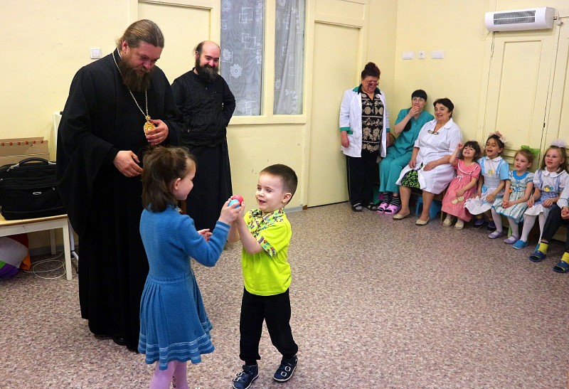 Владыка еще не вошел в здание санатория, а дети уже выстроились в два ряда у входных дверей. Наконец дверь открывается и Владыка с порога радушно приветствует маленьких пациентов: «Христос воскресе!» В ответ раздается дружное, радостное и многоголосное: «Воистину воскресе!»