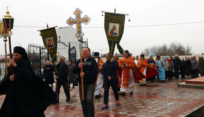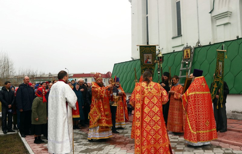 В конце Литургии под пасхальный звон новых колоколов состоялся крестный ход с крестом, хоругвиями и иконами вокруг собора.