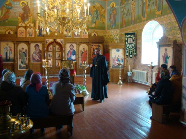 По окончании беседы иеромонах Мелхиседек ответил на вопросы присутствующих учителей и провел экскурсию по храму, в котором полтора месяца назад была завершена роспись храмовых стен.