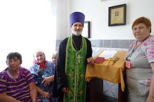 На чине освящения присутствовали директор Ордынского «Комплексного центра социального обслуживания населения» Федорова Вера Юрьевна, заведующая Шарапским филиалом отделения милосердия Тенькова Елена Анатольевна и жители дома милосердия. Чин освящения молитвенной комнаты совершил настоятель Никольского храма рабочего поселка Ордынского иерей Николай Иванов.