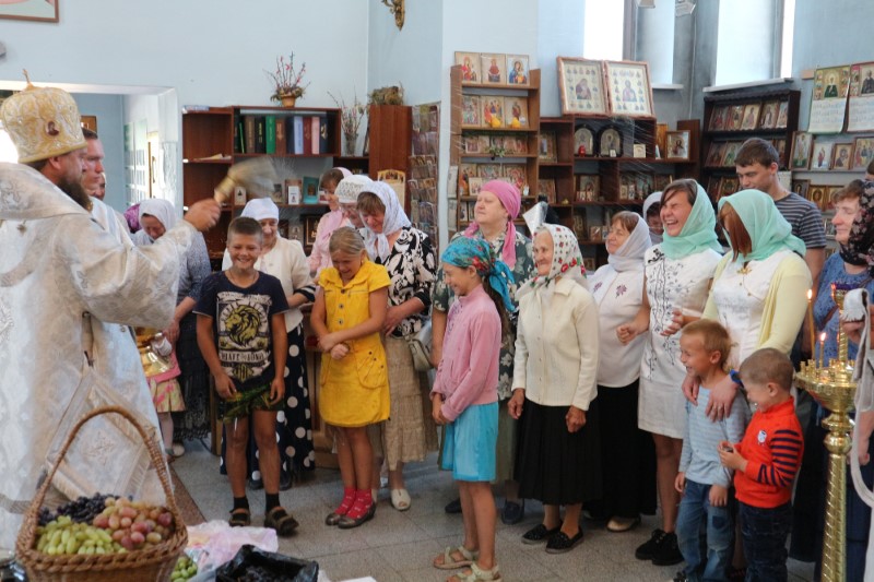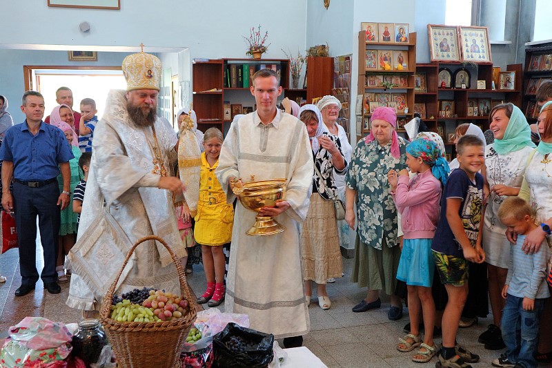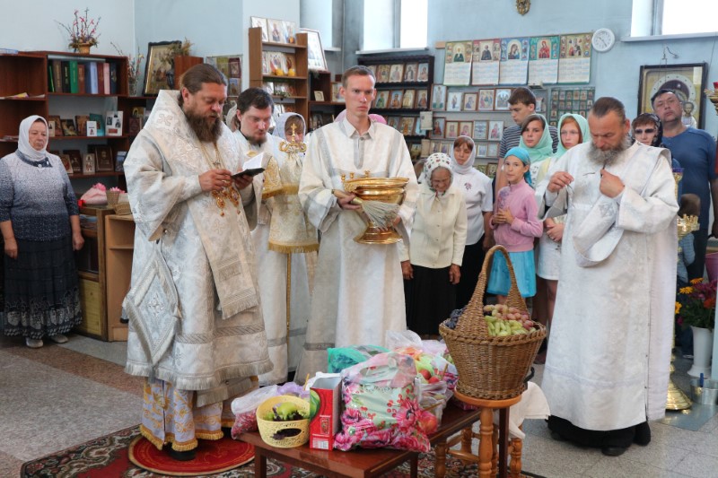 По заамвонной молитве состоялось славление празднику Преображения Господня, а также чин освящение плодов, которые принесли в храм прихожане, ведь праздник Преображения Господня в народе называют Яблочным Спасом.