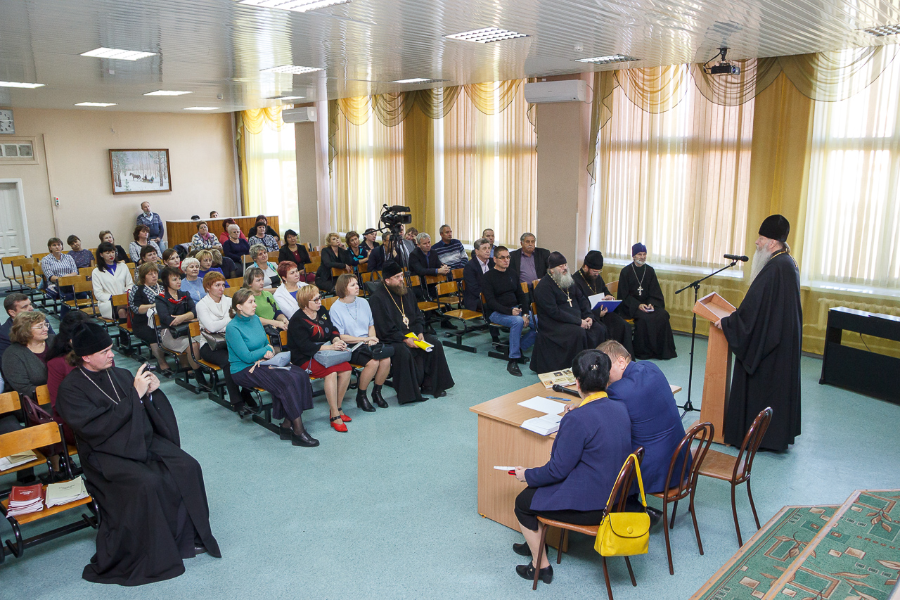Встречи с учителями, а затем и учащимися были особенно продолжительными. Владыка сообщил, что лично попросил главу района организовать совещание с работниками образования, поскольку тема, на которую он хочет поговорить – духовно-нравственное и патриотическое воспитание молодежи – представляется в настоящее время наиболее важной.