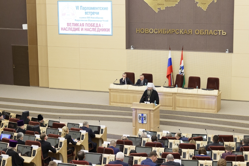 26 ноября в Законодательном собрании Новосибирской области в рамках XXIIIНовосибирских Рождественских образовательных чтений прошли VIПарламентские встречи, посвященные Великой Победе, 75-летие которой российский народ будет праздновать в мае 2020 года. Участниками встречи стали депутаты Законодательного собрания и Совета депутатов города Новосибирска, представители Правительства Новосибирской области и мэрии Новосибирска, священнослужители Новосибирской митрополии Русской Православной Церкви, учащиеся вузов, члены православных общественных организаций.«Мы будем говорить сегодня о нравственности, благочестии и вере, о том, без чего невозможна Победа, – сказал перед открытием Парламентских встреч митрополит Новосибирский и Бердский Никодим. – Достояние Победы касается каждого из нас, поэтому очень важно осознавать свою сопричастность к народу-победителю».