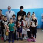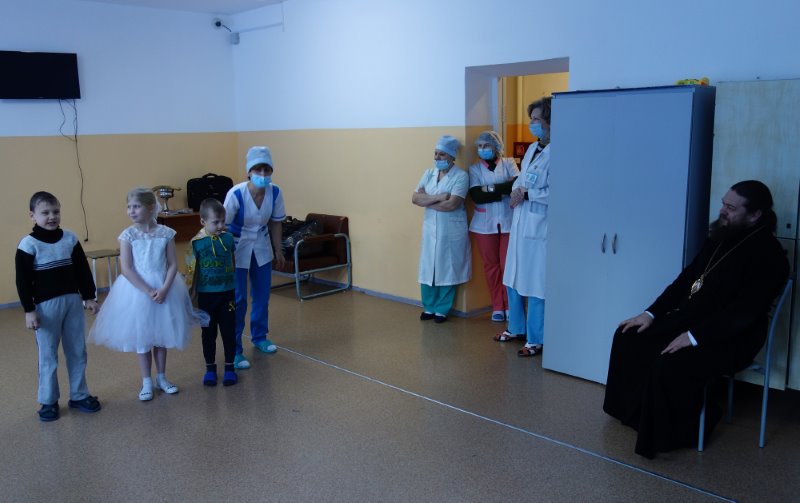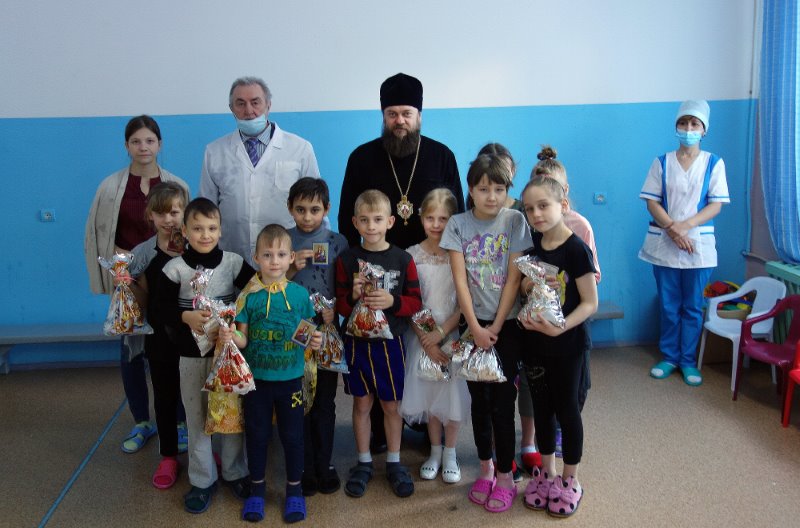 Архипастырь поблагодарил их за это теплое праздничное выступление, пожелал детям скорейшего выздоровления, сил и радости, воспитателям — здоровья, добра, внимания и любви к своим питомцам, окропил всех святой водой и раздал детям иконки и подарки.