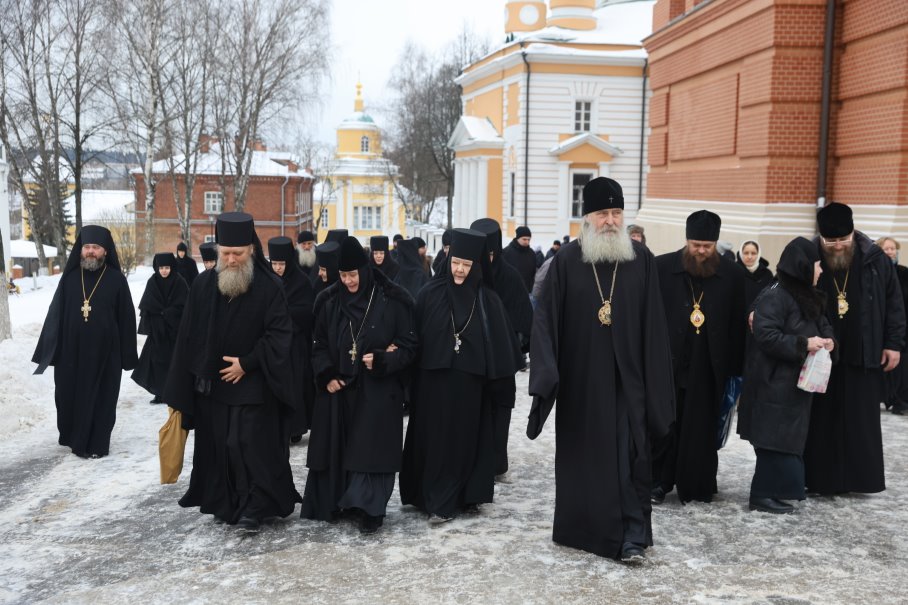 Его Высокопреосвященству сослужили братия Свято-Троицкой Сергиевой Лавры в священном сане, гости из числа духовенства и клирики Хотькова монастыря. В алтаре молились архиепископ Салехардский и Новоуренгойский Николай, наместник Спасо-Преображенского Соловецкого ставропигиального монастыря епископ Озерский Порфирий и епископ Карасукский и Ордынский Филипп.